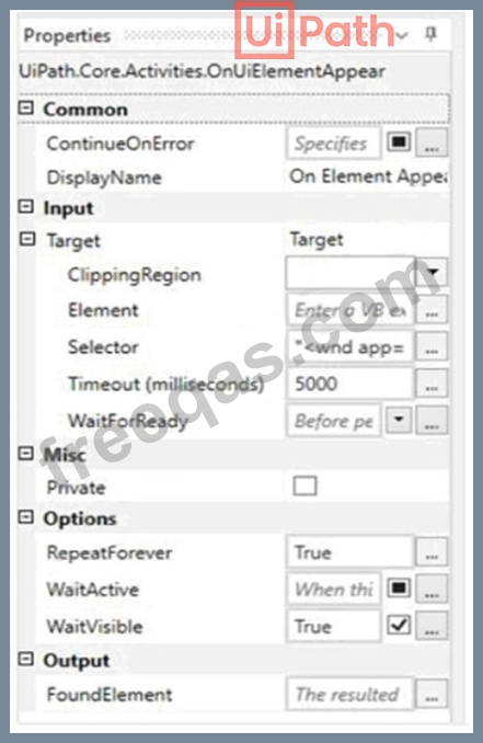 A developer created a process which extracts text from an element on an HTML website using a Get Text activity. The developer observed that the text can only be successfully extracted when the attribute "innertext" updates or changes from "false" to "true". The target element can take up to 20 seconds to load.