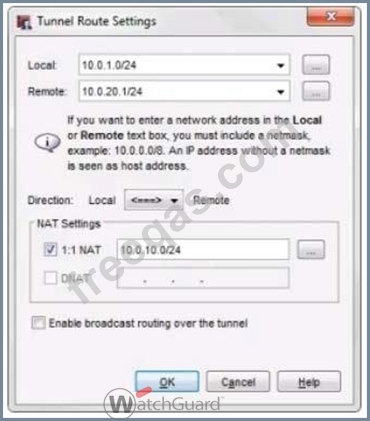 A local branch office VPN tunnel route is configured as shown in this image. On the remote peer device, what must be configured as the remote network address for this tunnel route? (Select one.)