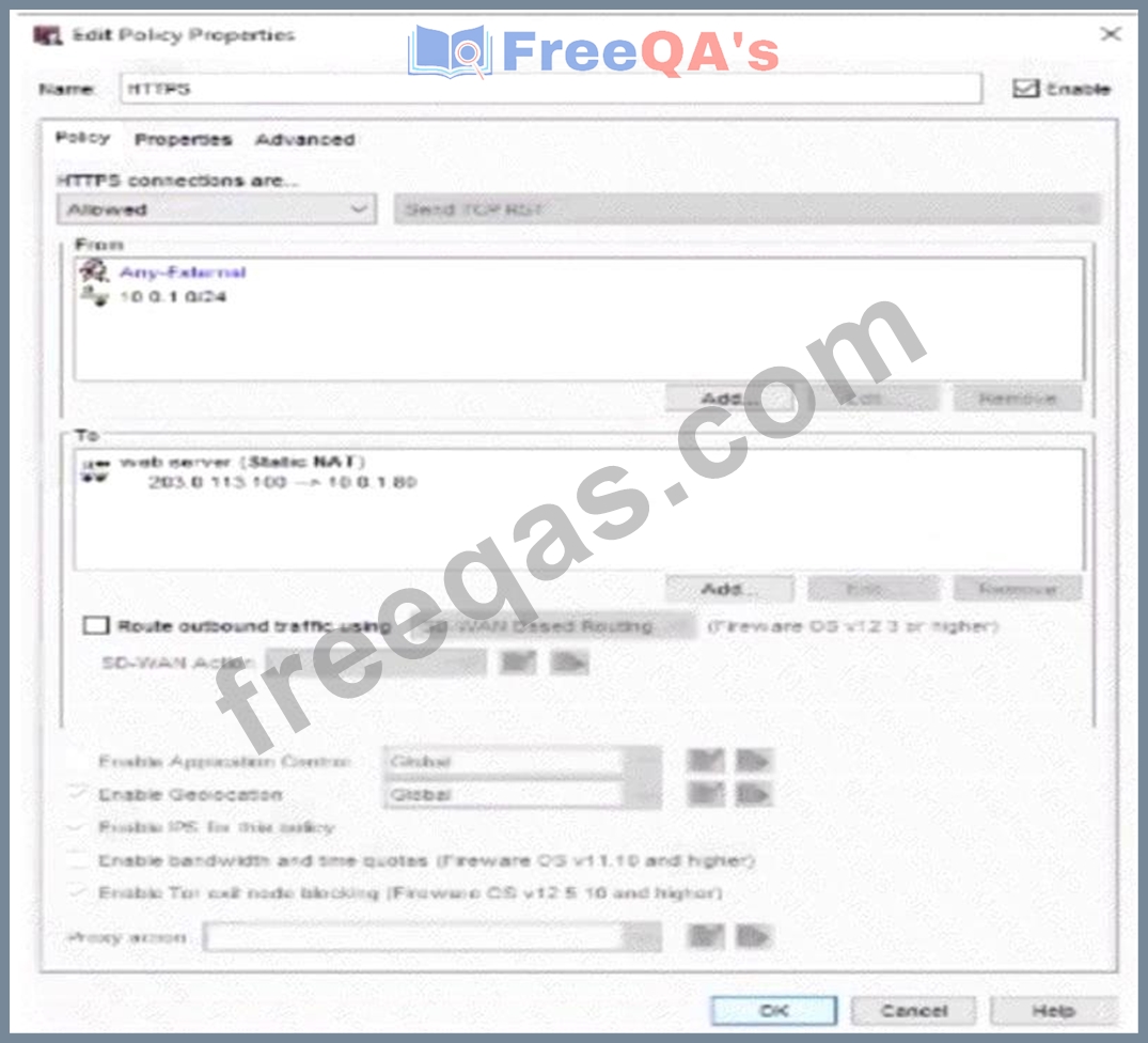 A Firebox has an external IP address of 203.0.113.100. A public web server with the IP address 10.0.1.80 is connected to a Firebox internal network. What is the effect of the policy shown in this image? (Select one.)